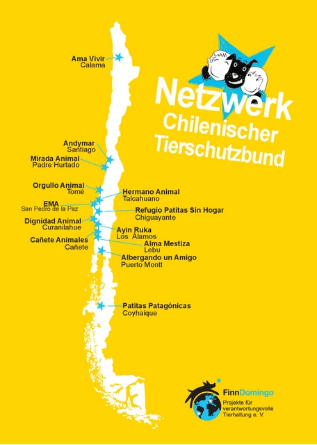 Die Mitglieder des Netzwerks sehen FinnDomingo e.V. im gesamten Prozess als Vermittler, Brückenbildner und Ratgeber. Eine entscheidende Rolle dabei spielt die Projektkoordinatorin unseres Vereins, eine deutsche Lehrerin, die seit Jahren in Chile lebt und nicht nur die Sprache, sondern auch die Kultur des Landes bestens kennt und sich intensiv im Tierschutz engagiert. Die Lokalisierung und Überprüfung möglicher weiterer Interessenten sowie insbesondere die Koordinierung und Dokumentation der Netzwerkaktivitäten wären ohne sie nicht möglich.